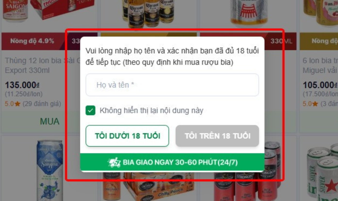 Bắt buộc phải có nút thao tác dẫn về trang thông tin/ website chương trình cụ thể và tại đây bắt buộc có hệ thống công nghệ chặn lọc, phần mềm kiểm soát tuổi của người truy cập để ngăn ngừa người chưa đủ 18 tuổi tiếp cận, truy cập, tìm kiếm thông tin về rượu, bia.
