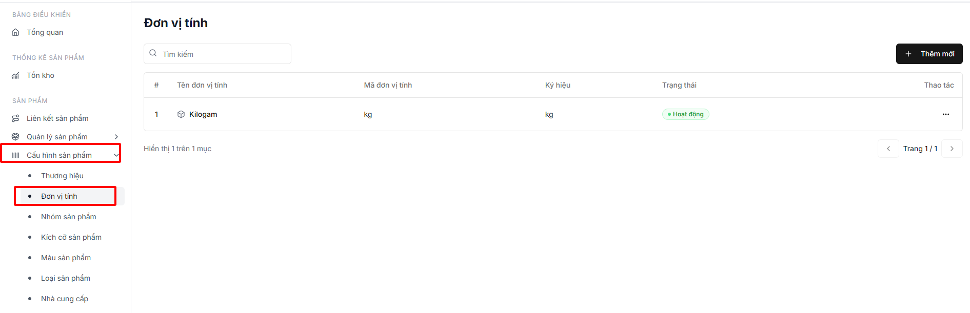 * **Hoạt động**: Bật/tắt để kích hoạt hoặc ẩn đơn vị tính trong hệ thống